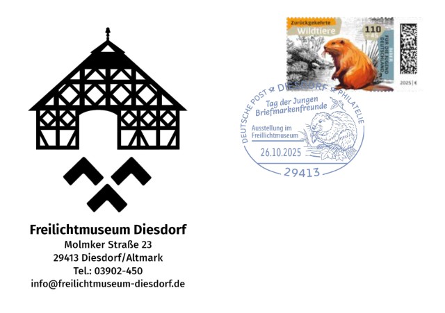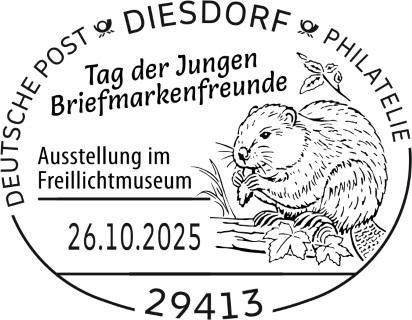 Die Deutsche Post präsentiert zu der Zentralveranstaltung einen Sonderstempel, der einen Biber zeigt. Damit passt der Sonderstempel perfekt zu den Jugendmarken, die am 7. August erscheinen. Der Wert zu 110 Cent zzgl. 45 Cent Zuschlag zeigt ebenfalls das Nagetier.