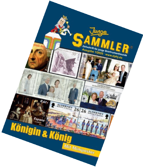 Im neuen JUNGE SAMMLER stehen Königinnen und Könige im Mittelpunkt. Neben berühmten Märchenfiguren wie König Drosselbart und dem Froschkönig erfährst du Wissenswertes über die Könige Norwegens, die deutschen Könige Friedrich II. und Karl den Großen. Du erfährst aber auch mehr über Poststempel, die den Kopf des Königs umrahmen, oder die Portofreiheit für königliche Post. Dies und noch mehr spannende Artikel geben zahlreiche Anregungen für den offenen DPhJ-Wettbewerb „Stamp it! Jede*r kann mitmachen“. Alle Informationen zur Teilnahme und Durchführung sowie zu den Deutschen Mannschaftsmeisterschaften in Vlotho findest du im Heft. Dort in Ostwestfalen treten Teams in einem philatelistischen Wettkampf um den Titel des Mannschaftsmeisters an. Machst du mit?