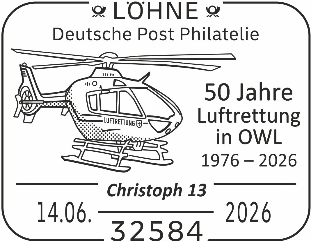 Doch nicht nur wegen des Über­ra­schungs­ge­schenks lohnt sich der Aus­stel­lungs­be­such: Gleich drei Son­der­stempel hat das Event-​Team der Deut­schen Post im Ge­päck, und so könnt ihr in Löhne wun­der­schöne Samm­ler­be­lege ab­senden. Sie zeigen eine Wal­dohreule als Mas­kott­chen der Aus­stel­lung (auch be­reits im letzten Heft ab­ge­bildet), den Ret­tungs­hub­schrauber „Chris­toph 13“, der seit nun­mehr 50 Jahren im Dienst des Men­schen steht, und zwei Werte der Dau­er­mar­ken­serie „Post­horn“, die in diesem Jahr ihren 75. Ge­burtstag feiert. Pas­sende Be­lege werden selbst­ver­ständ­lich auch an­ge­boten. Die Aus­stel­lung ist am 13. Juni 2026 von 10 bis 17 Uhr und am 14. Juni 2026 von 10 bis 15:30 Uhr ge­öffnet; der Ein­tritt ist frei.
